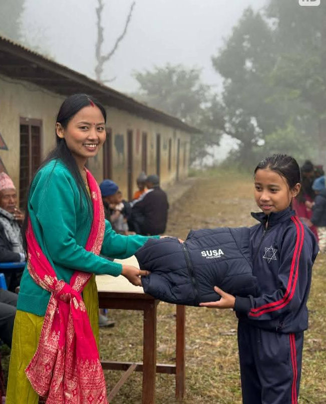 ऋषिङ गाउँ पालिका वडा नं ७ मचदाङमा रहेको अरुण अधारभूत विद्यालयका विद्यार्थीलाई न्यानो लुगा हस्तान्तरण गर्दै सविता थापा गर्जा मगर । सुसा कलेक्शनकी सञ्चालक मगरले विद्यालयका १० जना विद्यार्थीलाई निलो ज्याकेट प्रदान गरेकी प्रधानाध्यापक बीरबहादुर थापाले बताए । प्रअ थापाले सवितालाई धन्यवाद दिँदै बालबालिकाको सिकाई सुधारमा यसले सकारात्मक सहयोग पुग्ने विश्वास व्यक्त गरे । तस्वीरः बीरबहादुर थापा मगर