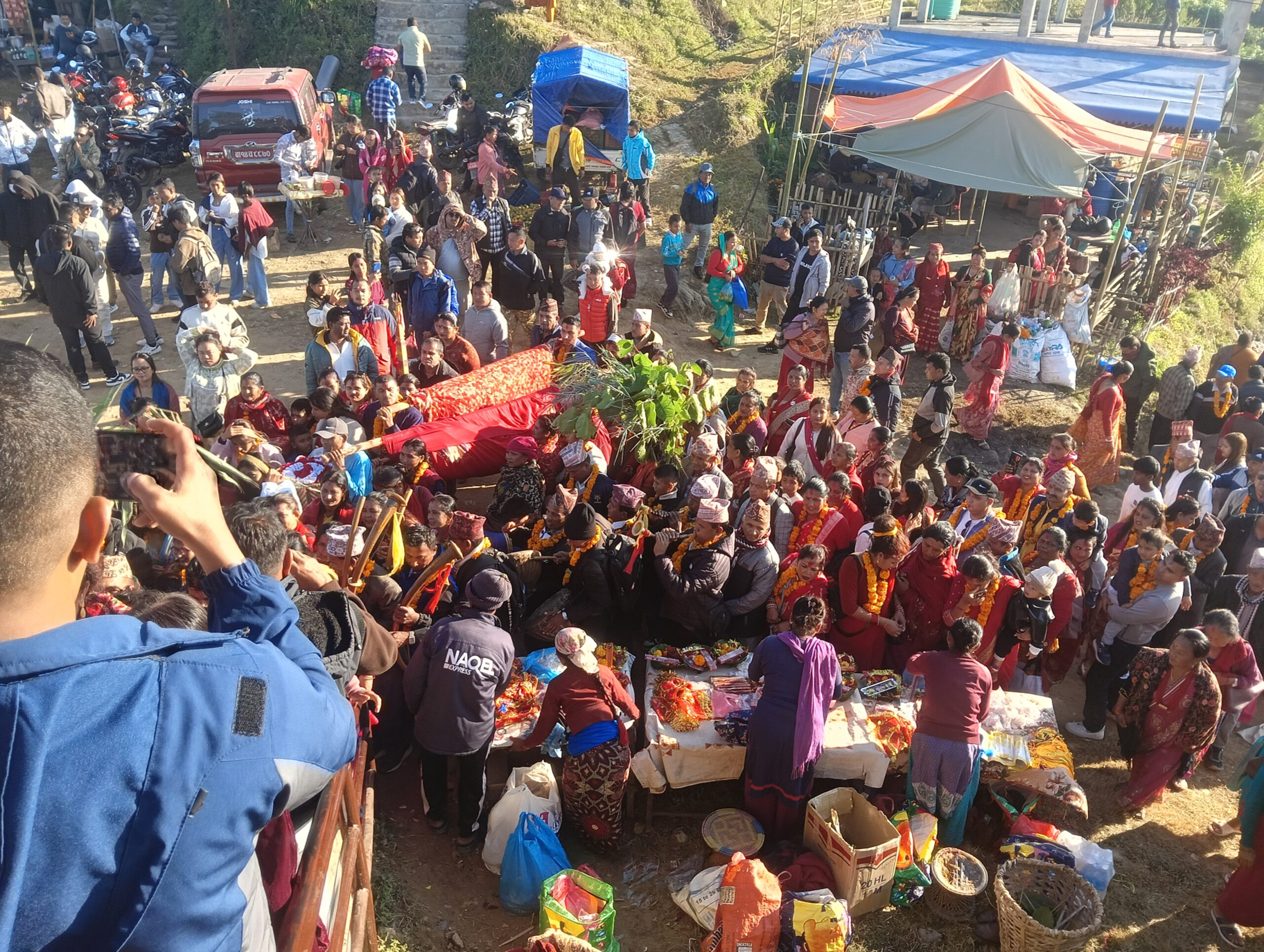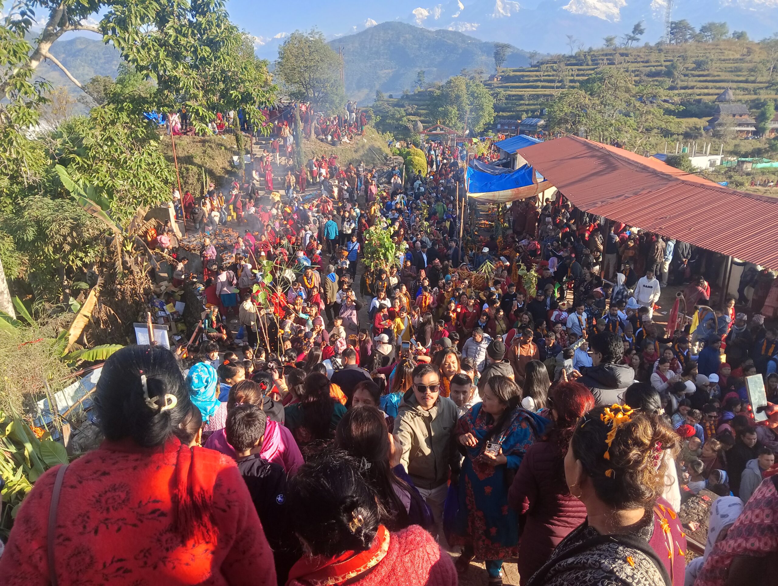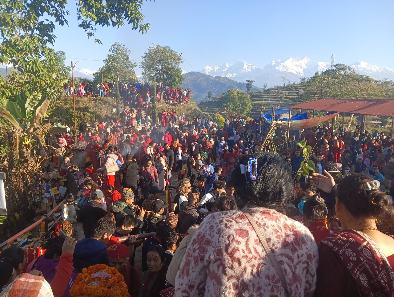कार्तिक २५ गते मंगलबार तनहुँको भानु नगरपालिका वडा नं ७ वसन्तपुरमा रहेको थानीमाई मन्दिरमा देखिएको दृश्य । समुन्द्र सतहबाट झण्डै १२ सय मिटरको उचाइमा रहेको मन्दिरमा विराजमान थानीमाईलाई स्थानीय स्वर्गकी देवीको रुपमा पुजा आराधना गर्ने गर्दछन् । पञ्चेबाजासहित फूलको डोली लिएर मन्दिरको तीन पटक परिक्रमा गर्दै देवीलाई चढाउने परम्परा रहेको यो मन्दिरमा विसं १८२५ देखि पुजाआजा हुने गरेको मानिन्छ । अन्नपूर्ण हिमश्रृङ्खला अन्तर्गतका हिमालको दृश्यावलोकन गर्न सकिने यो मन्दिरमा कार्तिक, मंसिर, माघ र फागुन महिनाको मंगलबार भक्तजनको भिड लाग्ने गर्दछ । तनहुँको एक महत्वपूर्ण धार्मिक र सांस्कृतिक धरोहरको रुपमा रहेको यो मन्दिरमा बली चढाउन प्रतिबन्ध छ । भौतिक पूर्वाधारको विकास तथा सडकको पहुँच विस्तारसँगै मन्दिरमा डोली चढाउने तथा बत्ती बाल्ने भक्तजनको संख्यामा समेत वृद्धि भएको छ । तस्वीरहरुः रमेश विकल