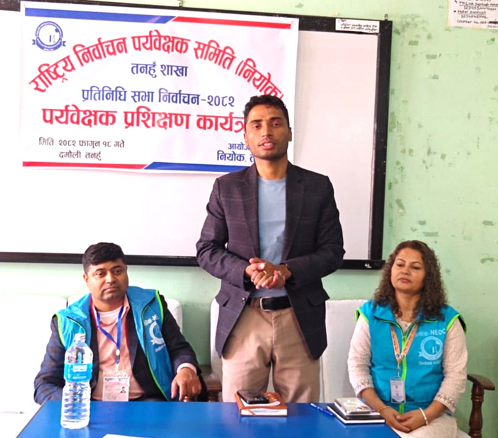 दमौली/प्रतिनिधि सभा निर्वाचन २०८२ को प्रर्यवेक्षण गर्नका लागि तनहुँ जिल्लाको १० पालिकामा खटिने पर्यवेक्षकहरुलाई सोमबार प्रशिक्षण दिएको छ । पर्यवेक्षकका रुपमा खटिने गरी छनौट भएका ११ जना पर्यवेक्षकहरुलाई राष्ट्रिय निर्वाचन पर्यवेक्षण समिति (नियोक) जिल्ला शाखा तनहुँले प्रशिक्षण दिएको नियोगका तनहूँ अध्यक्ष प्रकाशचन्द्र भट्टराईले तनहुँ आवाजलाई बताए ।